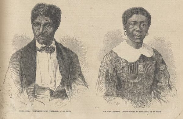 Dred Scott was born a slave in Virginia at the turn of the 19th century. Originally owned by the Blow family, he was sold to an army surgeon named Dr. John Emerson in 1832. The doctor lived in many places, including Illinois and Wisconsin, which were free states. But when Dr. Emerson and Dred passed into those places, nobody gave him his freedom. It wasn’t like he crossed the border and someone said — you’re free now, you don’t have to be here. No. Dr. Emerson just took him along like luggage. Like anything else he owned.